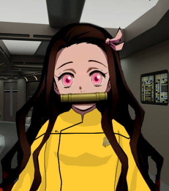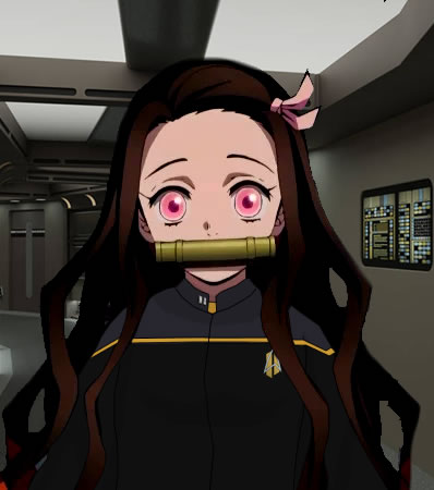 | Personal History | Nezuko and her twin brother Tanjiro were born in the capital city of the planet Amphei Prime in Federation year 2367. Their parents, Hazuki and Yuria, were mid-level administrators in the planetary government in the years leading up to First Contact. Hazuki worked with the senior leadership while Yuria worked in the space program. The Federation starship USS Malinche arrived in orbit of Amphei Prime four years before Nezuko was born, having detected a warp drive test from the Amphean space program. Nezuko’s father was on the team which worked between the Prime Minister’s office and the Federation embassy, while her mother worked with Starfleet engineers to begin integrating Amphean and Federation technology, such as comms networks and power supplies. Among the most important problems to solve was life support, given the Amphea need to breathe nitrate instead of oxygen. But Nezuko, as well as Tanjiro and their younger sisters Kaede and Miyori, never knew a life without knowledge of the Federation, and always had close contact with Federation people. As a child, Nezuko went as often as she could to see her mother’s work. She would get to play with the prototypes made by her people, using experience from Starfleet visitors who had to help integrate Amphei Prime into galactic society without breaking their Prime Directive. She also got to try Starfleet technology sometimes, and even visited their embassy with the new breathing apparatus which would let Amphea visit other worlds, including Earth. As a teen, her parents took her entire family to a reception aboard USS Malinche — which returned on the twentieth anniversary of First Contact for a celebration. Seeing the starship was enough to clinch her decision. She would apply for Starfleet Academy (though she was not the first, there having been several exchange officers and six successful new applicants in the previous years). At age eighteen, she was accepted. She said farewell to her family and took an eight-week journey by various civilian transit lines to get to Earth in time for classes. For the rest of her life, she would remain in fairly frequent contact with her family back home. She was isolated at first at the Academy, finding communication very difficult, but eventually found a best friend in Diare Hibor, a Betazoid linguistics student who could pick up the essence of her meanings quite clearly. They became roommates in second year, and were inseparable until graduation. During summer breaks, they traveled much, and even managed to rent a runabout and visited Amphei Prime (Diare wearing a space suit for most of the visit, but with a new Class M tent-town having since been built at the spaceport to accommodate tourists and traders). Study-wise, Nezuko shifted between engineering and operations, eventually ending up in the latter. She was excellent with computers (physical units and programs) and kept on hand a heavily modified PADD which she used for communication (typing and displaying messages for others). She did very well, earning attention from her teachers — though often as a curiosity. In 2389, she got her first assignment as a junior operations officer aboard USS Susquehanna, but she never seemed to shake the feeling that she was offered the assignment by a First Officer who simply wanted to meet an Amphea. Unfortunately, Diare couldn’t follow, but the two kept in touch over subspace and are still good friends. Diare reached out to a few people her brother knew aboard the Susquehanna and had them help Nezuko get integrated into the ship’s social circle. From that point on, she was noticed less for her strange eyes and breathing tube and more for her abilities. In 2394, she was given the position of Assistant Chief Ops Officer and promoted to Lieutenant junior grade. In 2396, she was recommended for Chief Ops Officer of USS Tokyo. |
