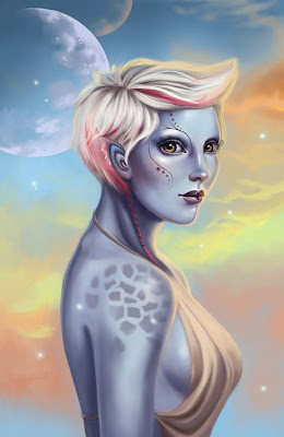 | Physical Description | Amari is a typical Lesrai female. Blue skinned, short, slim, youthful and cute with somewhat pointed ears A swirl and dot pattern above and along the inner side of her right eye marks her out as a member of clan Sisra and another pattern under her eye marks her as having married into the Karaya clan |