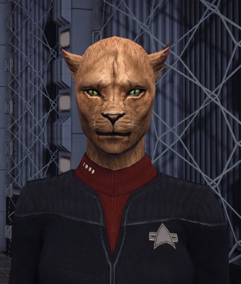 | Physical Description | M'Elise is typical, if somewhat short, for a Caitian. She is strong though not muscular, having a litheness few humans can match. Her body is covered in soft golden fur. This fur covers most of her body except her head and face where it has grown out to resemble hair. . M'Elise's tail extends almost to the floor where it curls up slightly. |